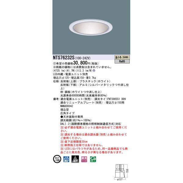 パナソニック NTS76232S テクニカル照明 ダウンライト 天井埋込型 LED(温白色) 広角47度 ライコン別売 電源ユニット別売 埋込穴φ125 ホワイトの相場買取価格